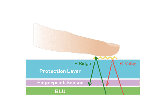TFT 指纹扫描感测技术利用薄膜电晶体 (TFT) 当作光感测元件,,,藉由非晶硅 (a-Si) 与低温多晶硅(LTPS)既有光电转换特性对不同波段光源进行吸收,,,,使感测 IC 读取阵列感测元件的光漏电差异,,转换成数位灰阶影像。。